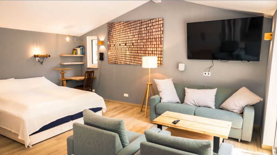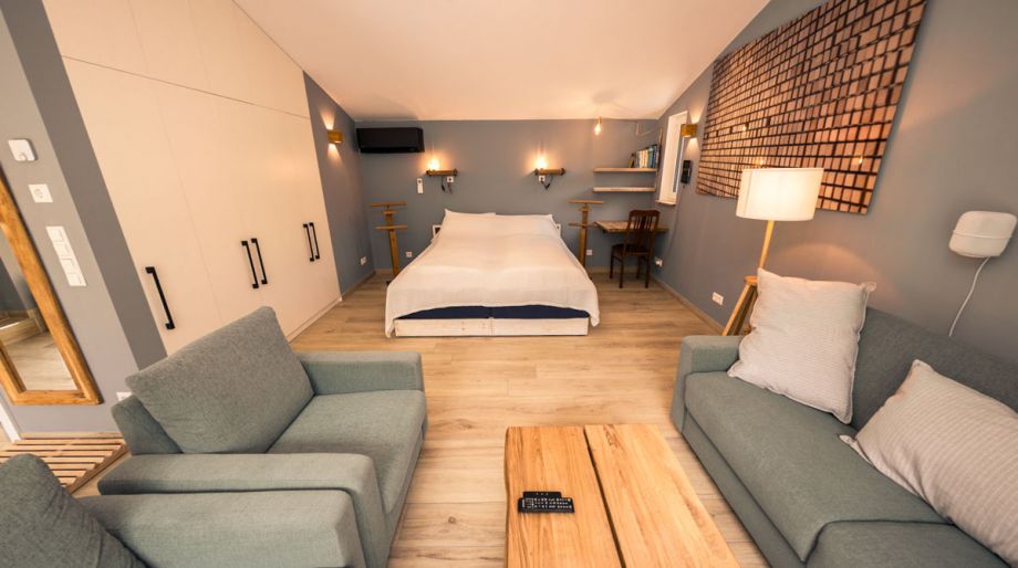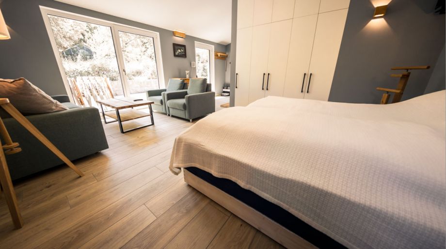 Of course, we have thought about the smaller visitors and also provided a high chair for children. In the living room / bedroom 28 square meters are two beds (which can be placed together or separately) and a sofa bed with two armchairs.